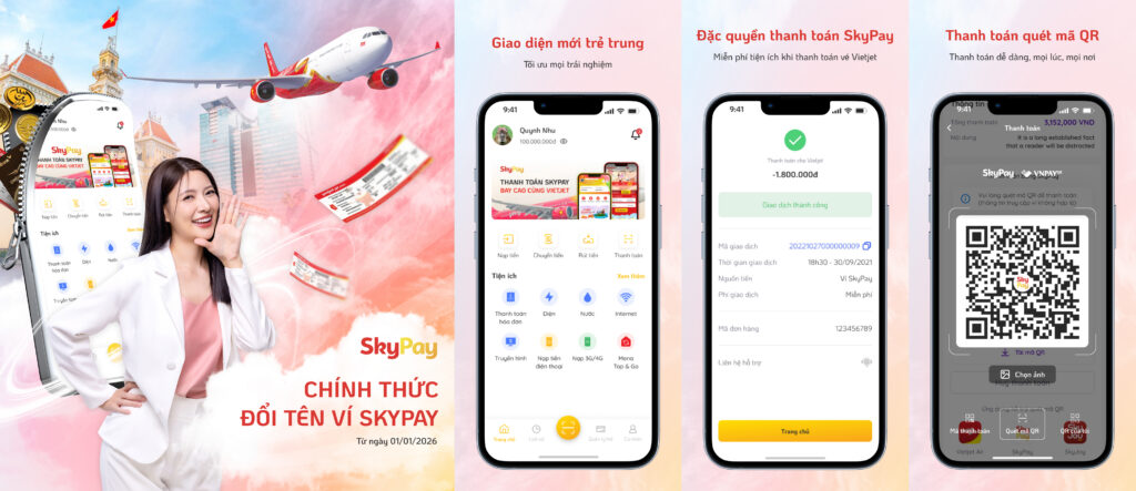 Tên gọi SkyPay sẽ thay thế hoàn toàn Galaxy Pay và hiển thị đồng bộ tại Ứng dụng Ví điện tử SkyPay – Ứng dụng độc lập do Công ty TNHH Galaxy Pay phát hành và nền tảng Ví SkyPay được tích hợp trên website và ứng dụng của các đối tác chiến lược (vietjetair.com, skyjoy.vietjetair.com, ứng dụng Vietjet Air, SkyJoy…).