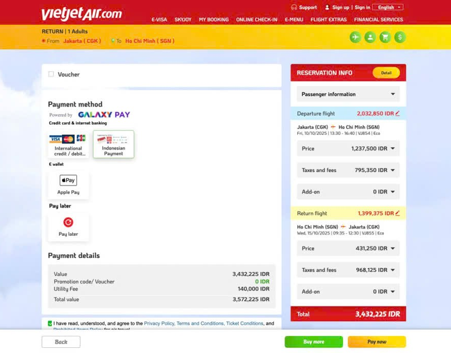 Khách hàng tại Indonesia có thể trải nghiệm phương thức thanh toán mới ngay hôm nay tại website www.vietjetair.com và ứng dụng Vietjet Air, đồng thời chờ đón thêm nhiều giải pháp thanh toán tiên tiến khác từ Galaxy Pay trong thời gian tới.