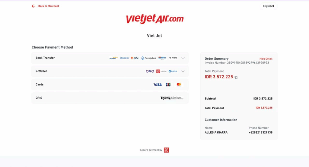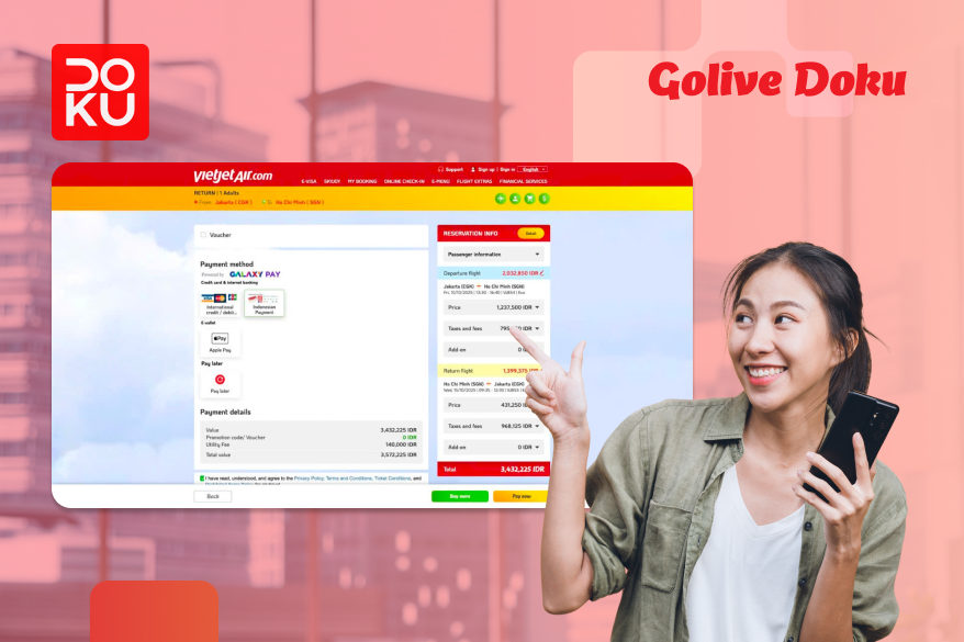 Vietjet Air, cùng Galaxy Pay - Vietjet Payment Hub tích hợp thành công cổng thanh toán DOKU (Indonesia) trên website www.vietjetair.com và ứng dụng Vietjet Air, mở rộng thêm lựa chọn thanh toán tiện lợi cho khách hàng tại thị trường Indonesia.